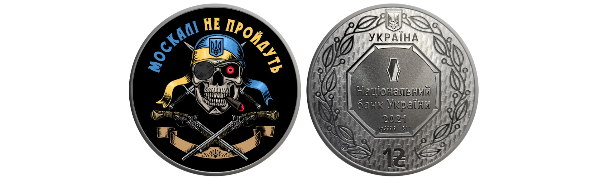It features a pirate skull with a covered eye, with the colors and coat of arms of Ukraine on a bandana and two crossed pistols below. The inscription "Москалі не пройдуть" (Moskale will not pass) refers to the determination in battle. Additionally, the coin has UV printing.