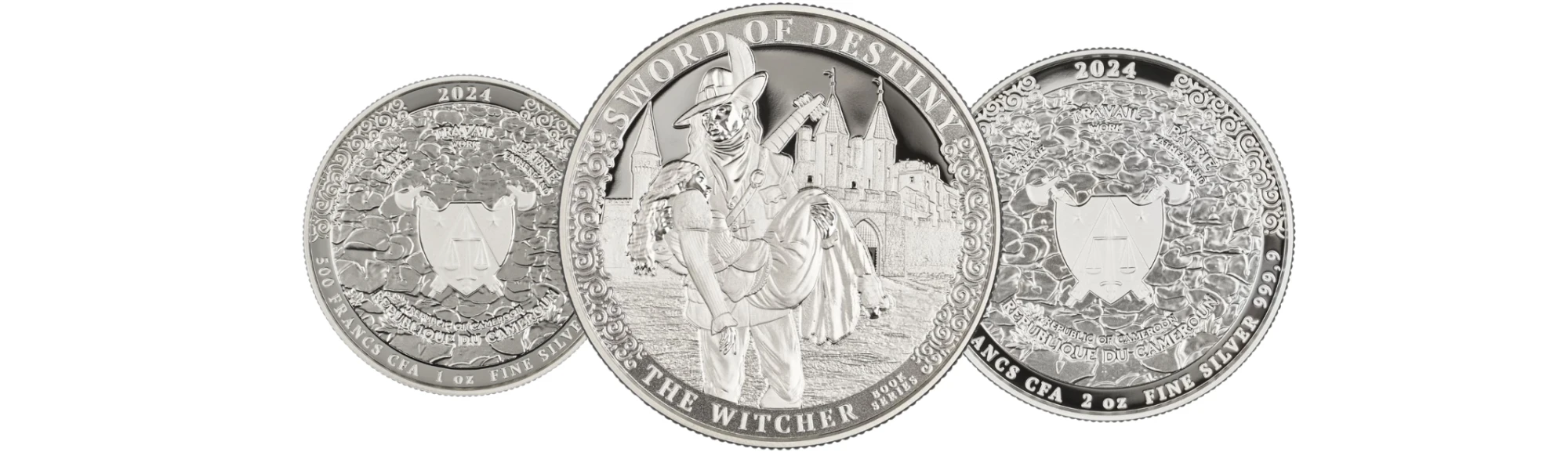 The coins depict "The Sword of Destiny," a legendary artifact from the realm of fantasy, available in two weight variants: 1 ounce and 2 ounces, corresponding nominally to 500 and 1000 Francs.