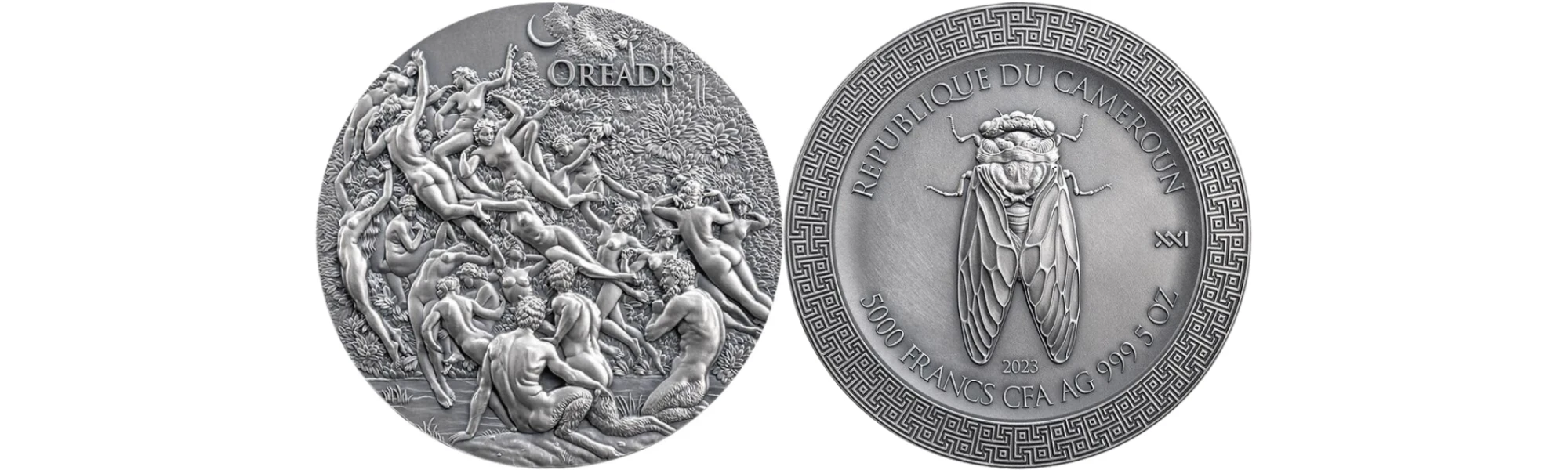 Crafted from 5 ounces of pure silver, the coin with a diameter of 65 mm transports us to the magical world of mountain nymphs, as depicted by William-Adolphe Bouguereau.