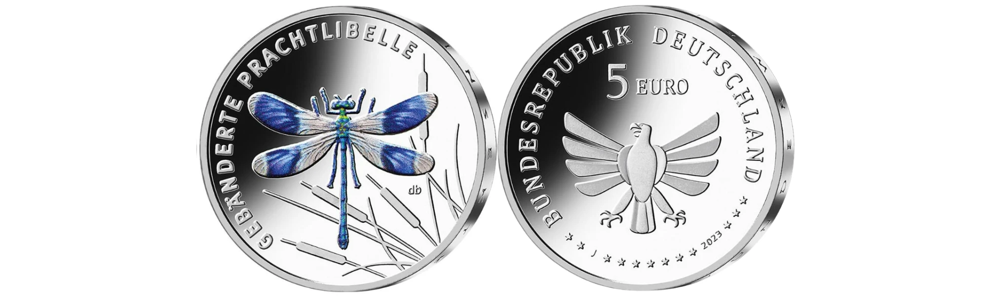 Wzdłuż krawędzi monety wygrawerowano napis "GEBÄNDERTE PRACHTLIBELLE", dodatkowo krawędź monety zawiera napis "WUNDERWELT INSEKTEN".