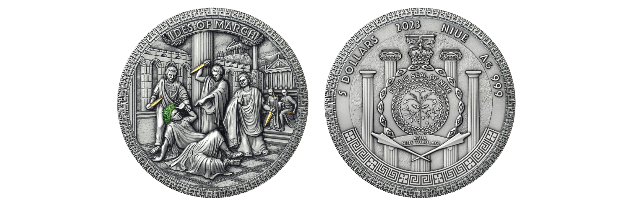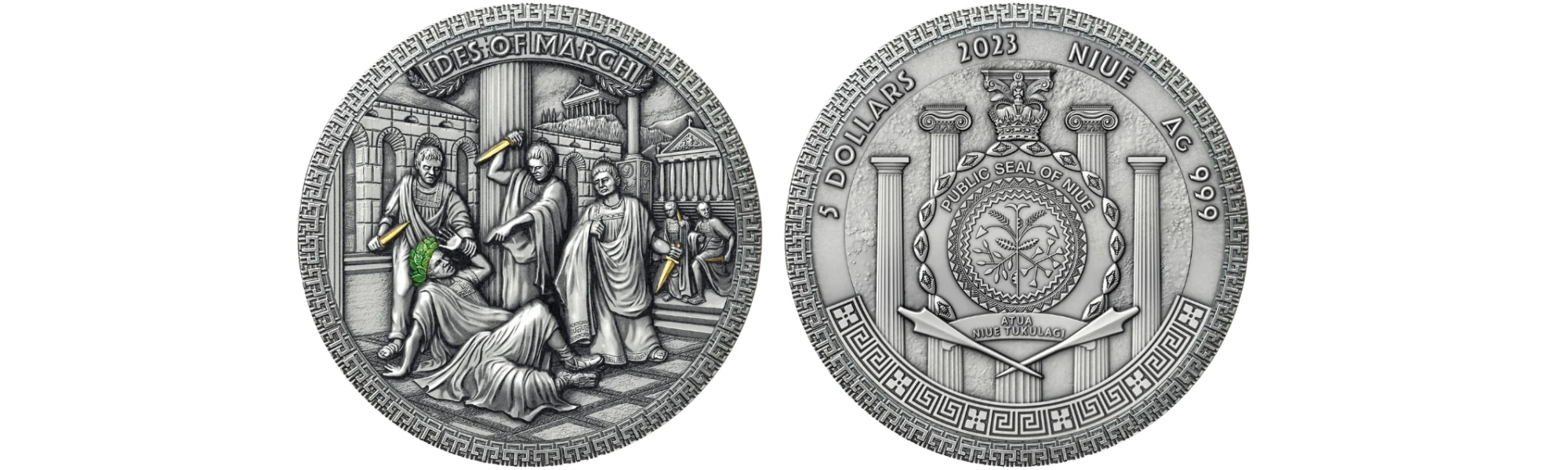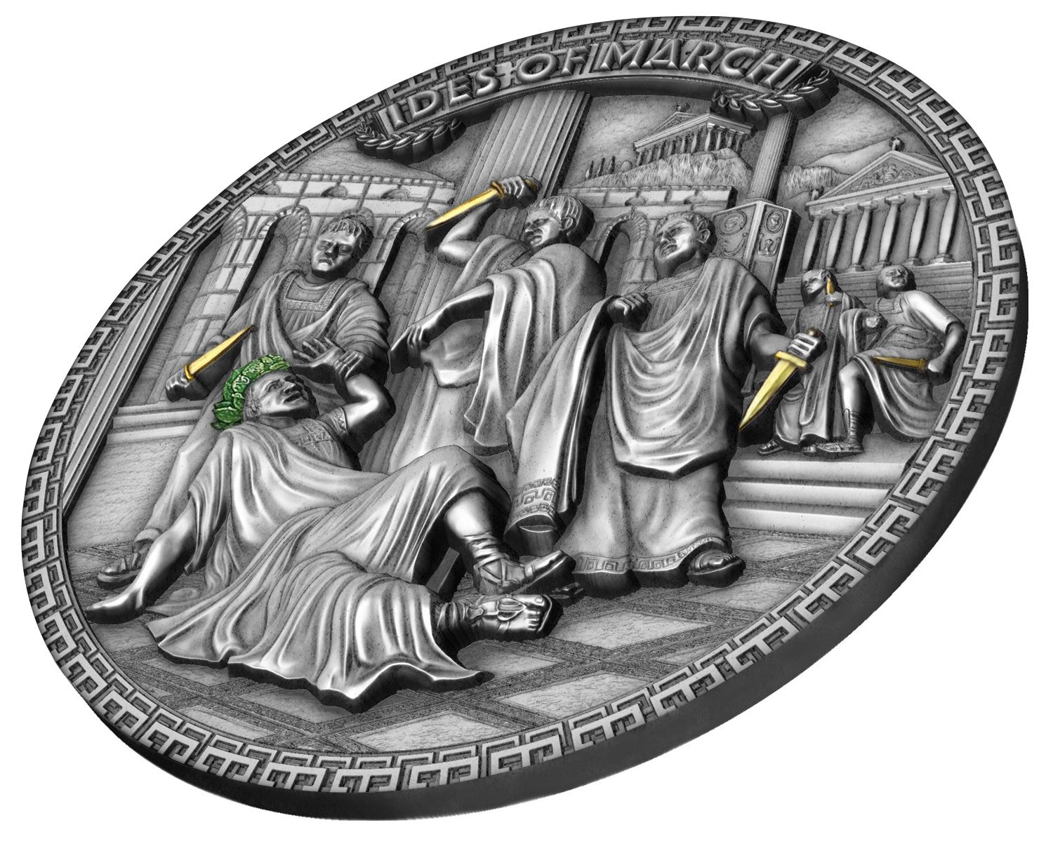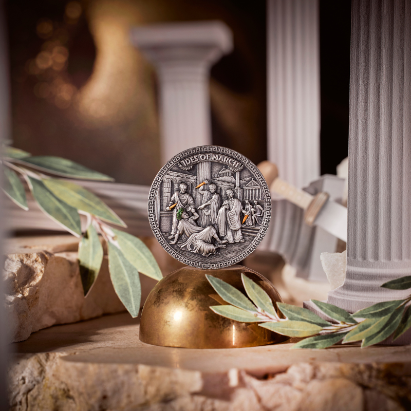 Cała scena zamachu na Juliusza Cezara została mistrzowsko oddana w wysokim reliefie, co nadaje monecie niezwykłej głębi i szczegółowości. Dodatkowym elementem, podkreślającym wyjątkowość tej monety, jest starannie wykonana wstawka oraz zastosowane selektywne złocenie.