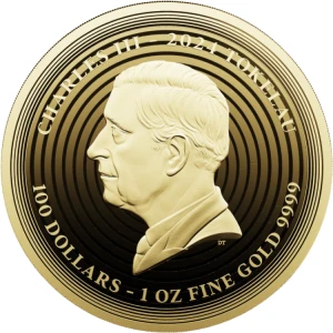 Awers przedstawia wizerunek Króla Karola III oraz informacje o wartości nominalnej, wadze, czystości kruszcu, roku bicia waloru i kraju emitenta.